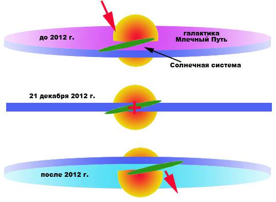 Наша солнечная система — часть диска собранного из звезд и планет, называемых карликовой галактикой Стрельца, как выяснилось совсем недавно. Мы вплотную приблизились в расположение другого, огромного, диска Млечного пути. Местоположение наше сейчас где-то на краю диска Млечного пути, и на вершине маленького (сравнительно) диска Стрельца. Но очень скоро мы переместимся в основание диска Млечного пути. Этот процесс проникновения в «Галактический Экватор» Млечного пути, сверху вниз, начнётся… 21 декабря 2012. Астрономический факт. Да. В момент зимнего солнцестояния. По странному стечению обстоятельств совпадающему с концом времен календаря Майя и концу перехода в эру Водолея.