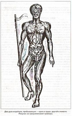 Два духа индейцев, пребывающих — один в груди, другой в животе. Рисунок со средневековой гравюры.