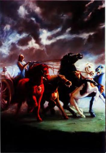 Обсусловленная душа сидит в колеснице материального тела. Возница (разум) держит вожжи (ум), пытаясь укротить чувства, которые подобны бешенным коням.