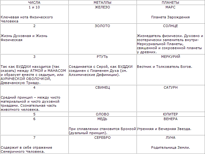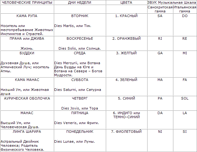Древние располагали планеты в следующем порядке: Луна, Меркурий, Венера, Солнце, Марс, Юпитер, Сатурн, засчитав Солнце в планеты по экзотерическим целям. Египтяне и индийцы, две старейшие нации, делили свой день на четыре части, каждая из которых находилась под защитой и правлением одной планеты. С течением времени каждый день начали называть по имени той планеты, которая правила его первой частью – утром. Когда христиане начали создавать свою неделю, они поступили следующим образом: они хотели день Солнца, или воскресенье, сделать седьмым, поэтому они наименовали дни недели, беря по-очереди каждую четвертую планету: например, начиная с Луны (понедельник), они считали так: Луна, Меркурий, Венера, Солнце,Марс,таким образом, вторник, день, первая часть которого управлялась Марсом, стал вторым днем недели, и так далее. Также следует помнить, что Луна, как и Солнце, есть заменитель одной сокровенной планеты.