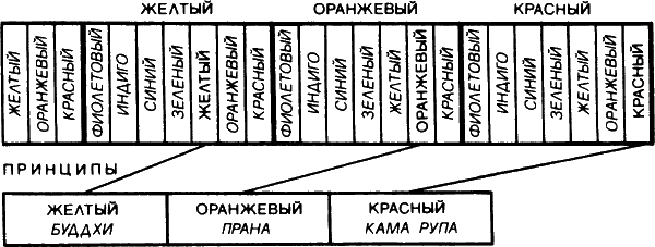 Эти Иерархии могут быть символизированы только как концентрические круги призматических цветов; каждая Иерархия представлена рядом семи концентрических кругов, каждый круг представляет один из призматических цветов в их естественном порядке. Но в каждом из этих «колес» один круг будет ярче и гуще по цвету, чем остальные, и это «колесо» будет иметь окружающую Ауру (кайму – как называют ее физики) этого цвета. Этот цвет и будет характерным цветом той Иерархии в целом. Каждая из этих Иерархий дает сущность (Душу) и является «Строителем» одного из семи царств природы, которые суть три элементальные царства, минеральное, растительное, животное и царство духовного человека.