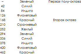 Посредством подобного вычисления мы можем поместить октаву ниже С' и выше С''. Написав эти три октавы в линию и перемножив на семь, мы получаем почти точное соответствие с нашей таблицей вибраций для четвертого чувства.