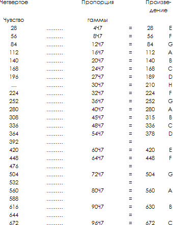 Четвертым чувством является чувство физического слуха, музыки, и его прогрессирование будет 28, или 4 х 7. Правильность этого доказывается тем фактом, что это согласуется с теориями науки, касающимися вибраций музыкальных нот. Наша гамма следующая: