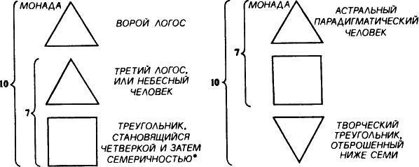 Следующая стадия не объяснена. Зеленый переходит кверху к Фиолетовому, Индиго, Синему; Треугольник открывается, чтобы принять его, и образует таким образом квадрат, Фиолетовый, Индиго, Синий, Зеленый. Это оставляет Красно-Оранжевый, Желто-Оранжевый и Желтый, и они, потеряв, таким образом, своего четвертого члена, могут образовать только треугольник. Этот треугольник поворачивается вершиной книзу, чтобы спуститься в материю, и «зеркально отражаясь на плане грубой материи, он перевернут», и выглядит так, как показано в диаграмме ниже.
