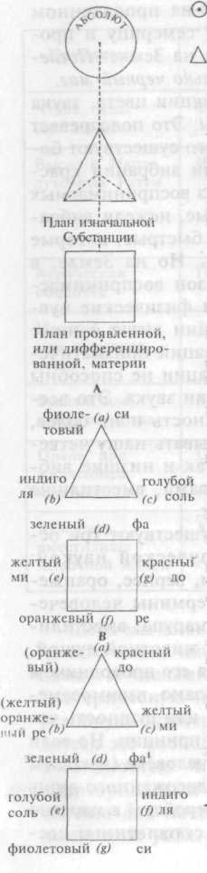 Первой геометрической фигурой после круга, или сфероида, является треугольник. Он соответствует движению, цвету и звуку. Так, точка в Треугольнике символизирует второй Логос, «Отца-Матерь», или белый Луч, который есть не-цвет, так как потенциально содержит все цвета. Он явлен излучающимся из непроявленного Логоса, или неизреченного Слова. Вокруг первого Треугольника, на плане изначальной Субстанции, в следующем порядке(обратномпо отношению к нашему плану) сформированы: