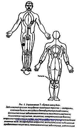 Продолжая упражнение, переходим на внутреннюю поверхность стопы, включая лишь большой палец; поднимаемся по передней и внутренней поверхности ноги, переходим на живот: далее делаем поверхностно оборот по кругу через соски и яремную ямку, как это показано на рис. 96, и спускаемся аналогично и симметрично — на противоположную сторону до стопы. Это один проход, оатем переходим на другую стопу и повторяем все еще раз. Таких проходов также надо сделать по 3 на каждое ощущение.