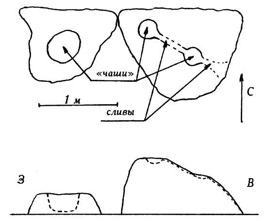 {72}. Помимо отдельных священных камней, экспедицией 2000 года были изучены и описаны четыре мегалитических культовых комплекса (капища), из которых два были обнаружены впервые (в результате специального опроса местных жителей). Священные камни, образующие сакральные центры двух этих святилищ — Козьинского и Краснохолмского, — принадлежат новому, доселе на территории России неизвестному, типу культовых камней-мегалитов, условно названному нами «камнями с жертвенными чашами».
