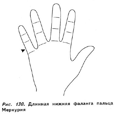 Люди с длинной средней фалангой пальца Меркурия (рис. 129), напротив, любят выражать себя таким образом. Конечно же, самыми длинными средние фаланги бывают на руках писателей, но также и на руках людей, владеющих искусством эпистолярного жанра, и тех, кому легче выразить свои мысли на бумаге, чем при помощи слов. Часто такие люди прекрасно осведомлены о своих способностях, но ничего не делают для того, чтобы их развить и найти им практическое применение.