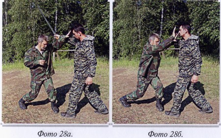 3. Ситуация третья: противник атакует вас боковым ударом палки или шашки. Вы внимательно следите за движением. В момент замаха быстро сокращаете расстояние, а потом круговым движением руки останавливаете руку противника. Дальше всё повторяется, следует серия ваших ударов.(фото 26)