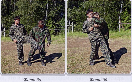 1. Противник атакует прямым ударом в голову. Вы, с началом его удара, делаете шаг вперёд и одновременно в сторону и, коснувшись своей рукой предплечья противника, вращаетесь вокруг своей оси, но не на 90°, а на 180°. После поворота вы ставите свою ногу позади противника и рукой, которая отразила предназначенный вам удар, бросаете нападающего через свою ногу. Но во время броска ваша вторая рука по кругу с разворота бьёт нападающего в пах.(фото 1)