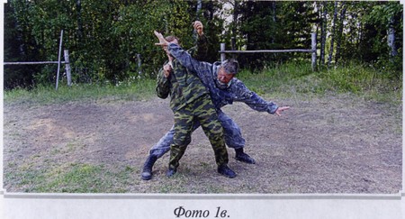 2. Противник атакует вас прямым ударом в голову. Уклоняясь в сторону, вы делаете тот же шаг ногами, что и в выше описанном случае, только теперь руки противника касается ваша другая рука. Она и является осью вашего вращения на 180°. После поворота вы одной рукой захватываете противника за волосы или за шею, а пальцами второй руки бьёте его по глазам. Потом следует бросок.(фото 2)