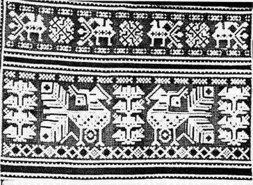 Для сравнения — между ними вышит человек, Похоже, что птицы, распустив хвосты и подняв крылья, сражаются между собой. А странный человек наблюдает за боем, На вышивке фактически изображены два гигантских страуса, но, как известно, в России подобные страусы водились только в Олигоцене 35 миллионов лет тому назад и в науке они называются Фаророкусами. Это были хищные бегающие птицы, достигающие в высоту пяти метров.