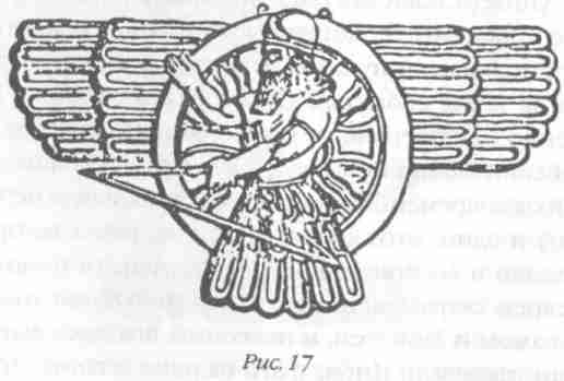 Вавилонский бог Мардук имел два обличья. В земном воплощении ему, облаченному в сияющие одежды (рис. 15), поклонялись как Илу (переводится как «бог», но буквально означает «величественный»); его борьба за главенство над другими богами аннунаками подробно описана в моей книге «Битвы богов и людей». С другой стороны, Мардук был небесным божеством, планетарным богом, который обладал теми же свойствами, играл ту же роль в сотворении мира, что и шумерский бог Нибиру, планета, которую чаще всего изображали в виде диска с крыльями (рис. 16). Ассирийцы заменили Мардука своим племенным богом Ашшуром, соединив оба божественных обличья и изображая его в виде бога внутри диска с крыльями (рис. 17).