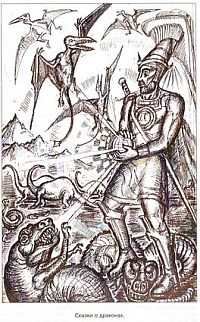 Не удивительно, что и облик доисторических ящеров совпадает с описанием чудовищ. Художники и скульпторы, наделенные интуицией, иллюстрируя древние сказания, создают произведения, в которых незримо, а порой и весьма зримо, проступают черты реальных персонажей — динозавров. Их характерный облик, правдоподобный и реальный, сам выходит из-под резца и кисти, удивляя не только зрителей, но и самих авторов этих изображений. Это происходит потому, что укорененный в народном сознании образ в неприкосновенности хранят народная культура (архетипы) и наши гены, доставшиеся нам от далеких предков. Пращуры наши не только видели динозавров, но и вступали с ними в ожесточенные схватки, из которых почти всегда, конечно, не без потерь, выходили победителями, что запечатлели сказания и легенды.