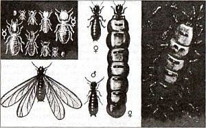 Обычно в семье термитов, насчитывающей от нескольких сотен до миллиона особей, есть одна яйцекладущая самка (царица) и оплодотворяющий ее самец (царь). Именно они в молодости заложили новое гнездо, вырыв небольшую ямку. Когда ямка в земле вырыта, самка откладывает немного яиц, из которых выходят личинки. Малюток кормят и «воспитывают» родители, а когда они подрастут и их станет больше, добывание пищи вменяется в обязанность уже им. По мере роста колонии заметно меняется самка, у нее атрофируются не только крылья, но и конечности, и даже ротовой аппарат. Самка становится неподвижной, всецело зависящей от кормящих ее детей-рабочих. Зато прогрессивно растет переполненное яйцами брюхо, которое увеличивается в десятки раз. Плодовитость самки просто потрясающая. У некоторых видов термитов самка за 24 часа откладывает свыше 3 тыс. яиц. Этакая живая яйцекладущая машина. Она и живет многие годы, откладывая за свою жизнь десятки миллионов яиц. Наверное, она счастлива, она получает удовольствие в десятки миллионов раз большее, чем ее сыновья и дочки. Они представляют из себя недоразвитых в половом отношении самцов и самок, на чьи не по-детски сильные плечи ложится груз по выкармливанию не только царицы с царем, но и огромного количества личинок, которым так же, как и им, предстоит стать рабочими.